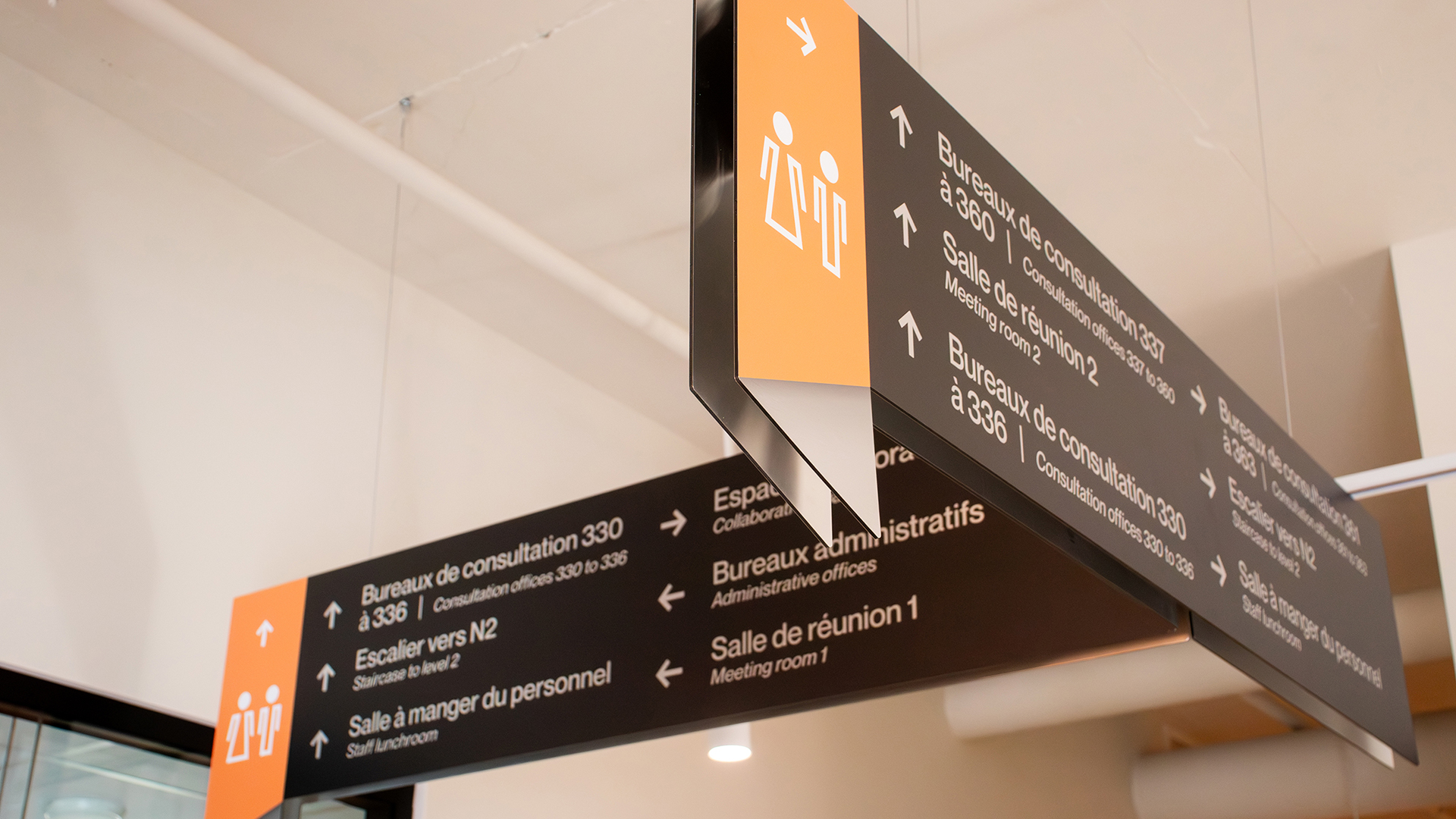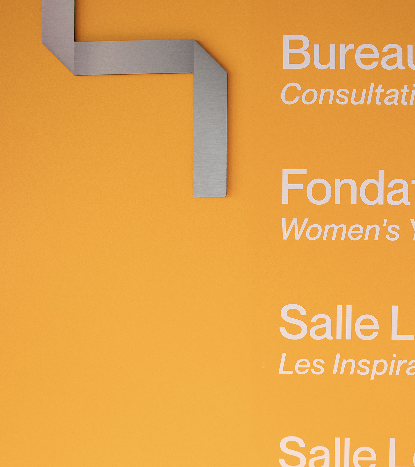Pour son déménagement, le Y des femmes de Montréal (YWCA) souhaitait renforcer son image de marque à travers l’architecture et le système de signalétique.Traduit par un grand geste sculptural, l’escalier central proposé par l’équipe d’architectes, rappelle la géométrie anguleuse du logo. Graphiquement réinterprétées, la signalétique et l’identité graphique de l’organisme tissent un lien sensible et cohérent à travers l’environnement.